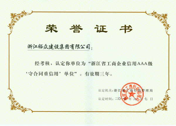 日期:2010-10-25日前,裕众集团荣获2010年浙江省 “守合同、重信用”AAA企业荣誉称号,这是公司继2007年之后再度荣获该荣誉称号。浙江省工商企业信用AAA级“守合同重信用”单位每三年评定一次,