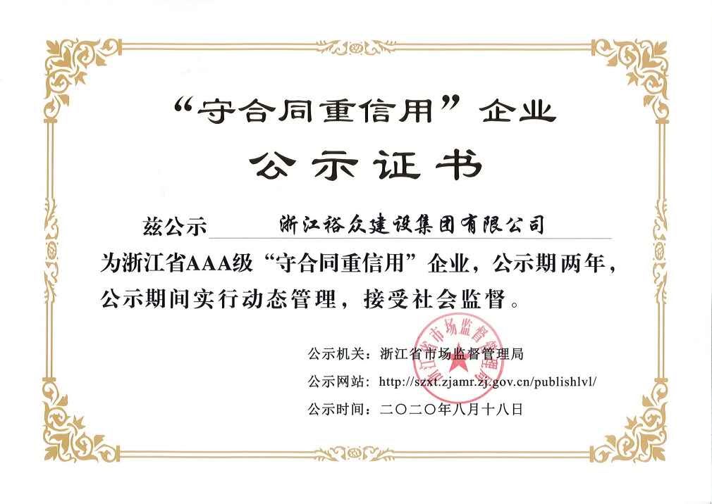 日期:2020-09-172020年8月18日,浙江省市场监督管理局发布了《关于公示2020年浙江省AAA级“守合同重信用”企业的通知》,我司被评为“AAA级守合同重信用”企业。合同信用等级评估是浙江省市场